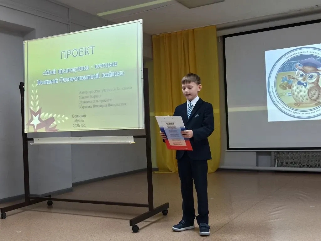 1 место – Павлов Кирилл, МКОУ «Большемуртинская СОШ № 1», тема проекта «Мой прапрадедушка — ветеран ВОВ», педагог Карасева В.В.;
