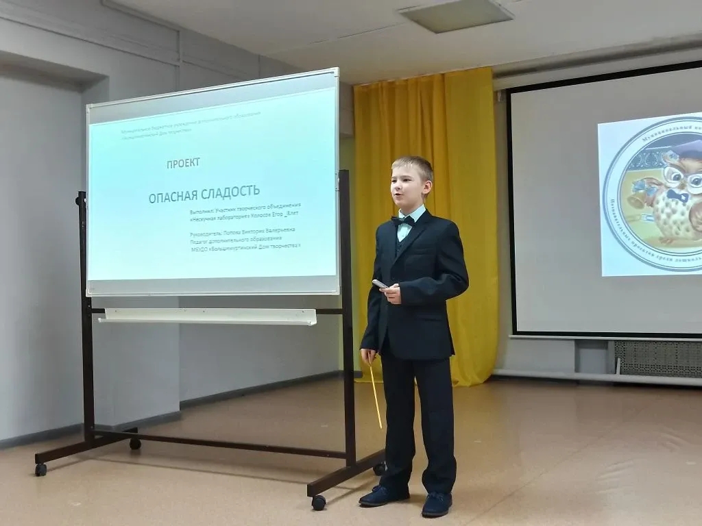2 место – Колосов Егор, МБУ ДО «Большемуртинский Дом Творчества», тема проекта «Опасная сладость», педагог Попова В.В.